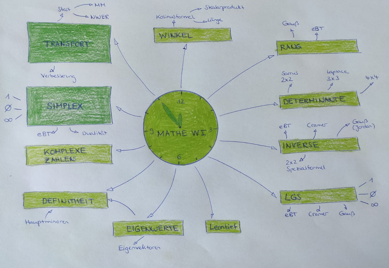 Modulbeschreibung: In der Schule beschäftigten wir uns mit Gleichungen und Gleichungssystemen und deren Lösbarkeit. Weiter geht es mit mathematischen Objekten wie Vektoren und Matrizen. Diese erlauben viele Berechnungen, wie das Skalarprodukt, den Winkel zwischen Vektoren oder die Determinante und Inverse einer Matrix. Einige Operationen (wie die Division) existieren für Matrizen nicht und grundlegende Eigenschaften (wie die Kommutativität) sind nicht immer gegeben. Die nächsten Themen im Umfeld von Matrizen sind Eigenwerte und Definitheit (die in Mathe WII wiederkehren). Zwischendurch gibt es einige Anwendungsaufgaben und Rechnen mit komplexen Zahlen. Den zweiten Teil des Moduls bildet die Optimierung. Simplex-Verfahren, und Transport- und Rundereiseprobleme sind nur einige der Themen, die auch in anderen Modulen wieder auftauchen (etwa Operations Research oder Produktion & Logistik). Aufpassen lohnt sich also!